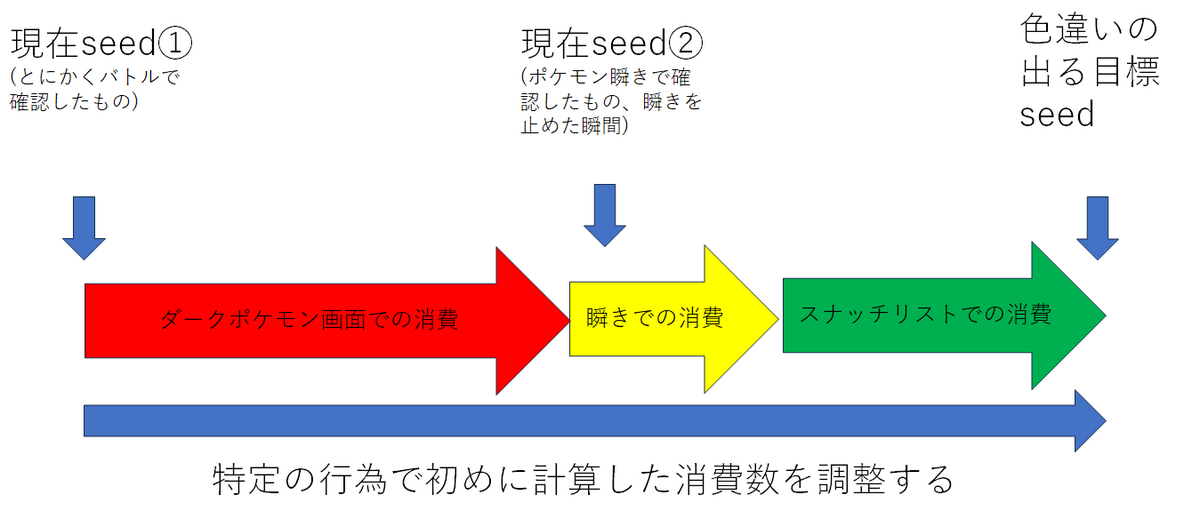 乱数値を前に進めるための【消費】を行って【色違いの出る目標seed】まで到着しないといけません。